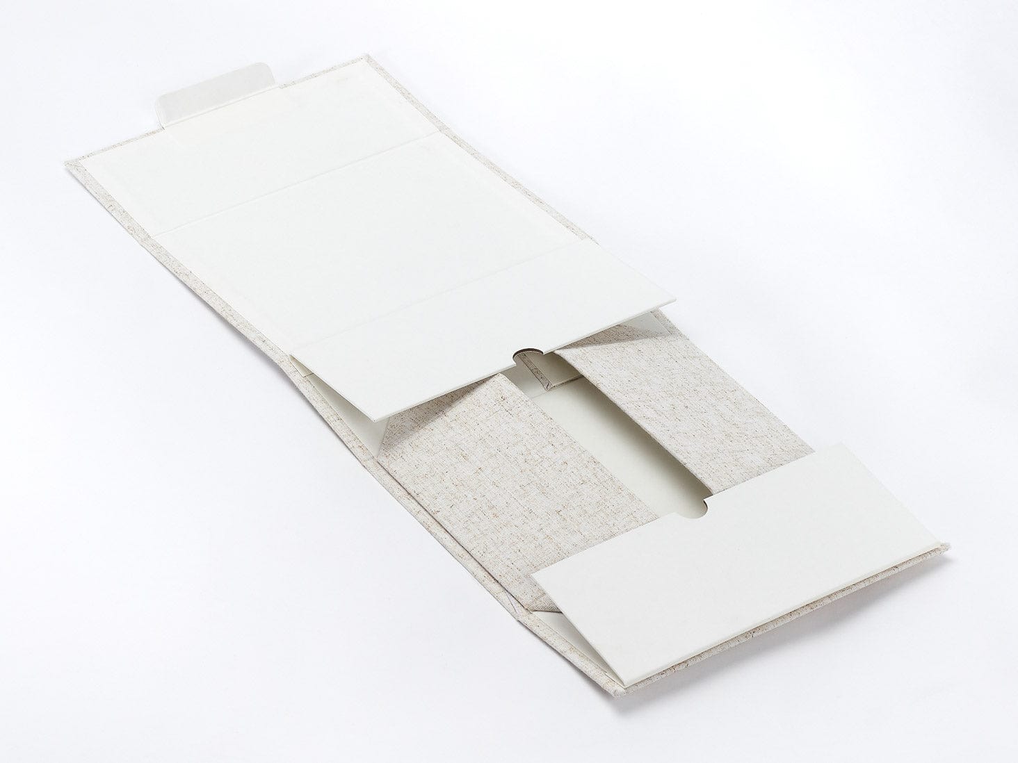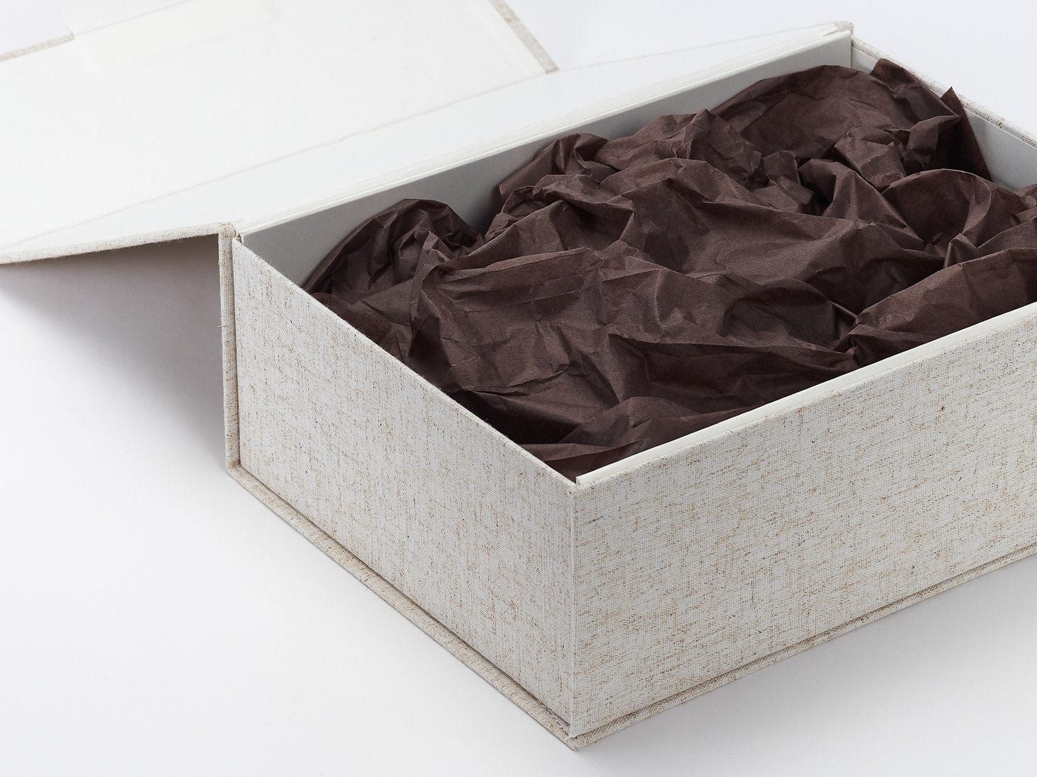 Our A5 Deep Natural Linen Gift Boxes are premium folding gift packaging wrapped in tactile natural linen with complementary ivory kraft paper lining. Perfect for retail, weddings, artisan gifts, and luxury brand presentation.