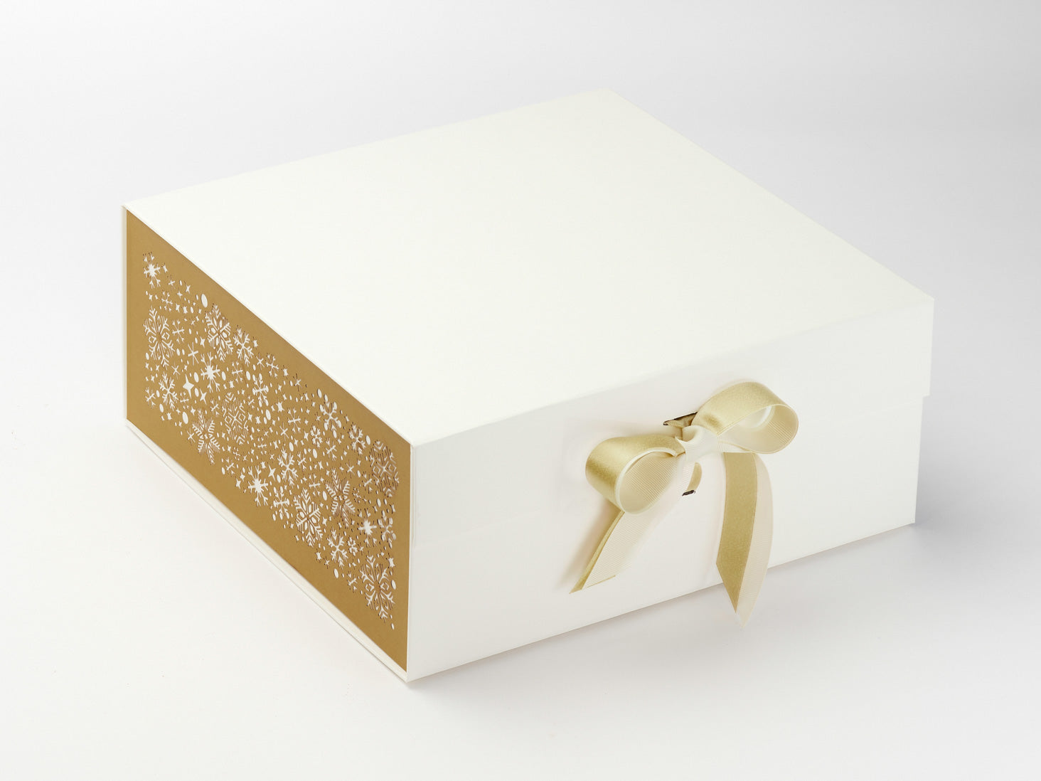 Enhance the Gold Snowflake panels with gold Ribbons and Decorative Closures and include a printed logo for a truly bespoke, luxury finish.