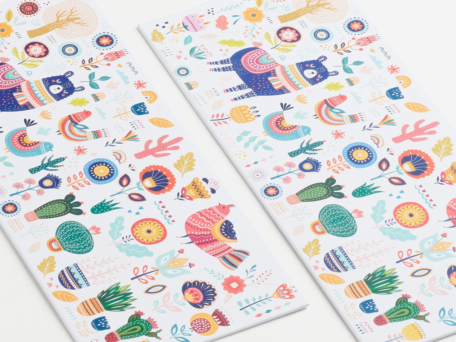 This lively print combines cacti, tropical flowers, playful birds, and a very cute alpaca in a riot of bright colours. Perfect for gifts that want to stand out and bring a smile - ideal for quirky homewares, party favors, stationery, keepsakes, or any gift that embraces fun.