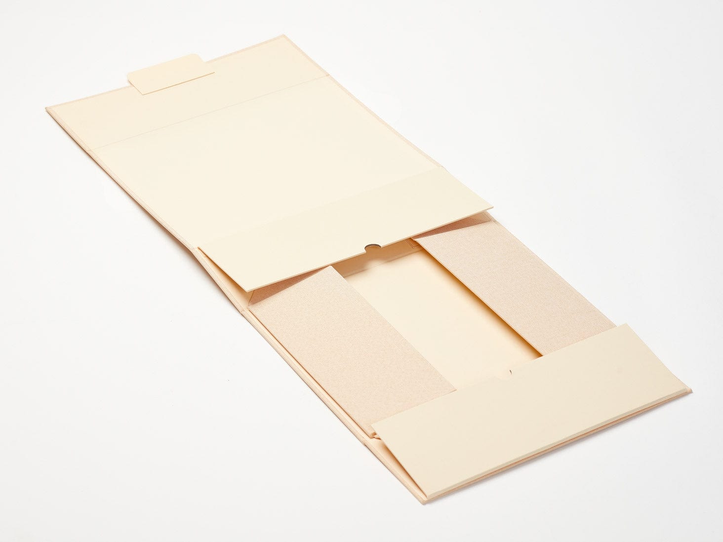 Featuring a warm, pastel apricot Hessian linen fabric, complemented by natural kraft paper lining. Designed without magnets, secured with a discreet front locking tab for heavier contents.