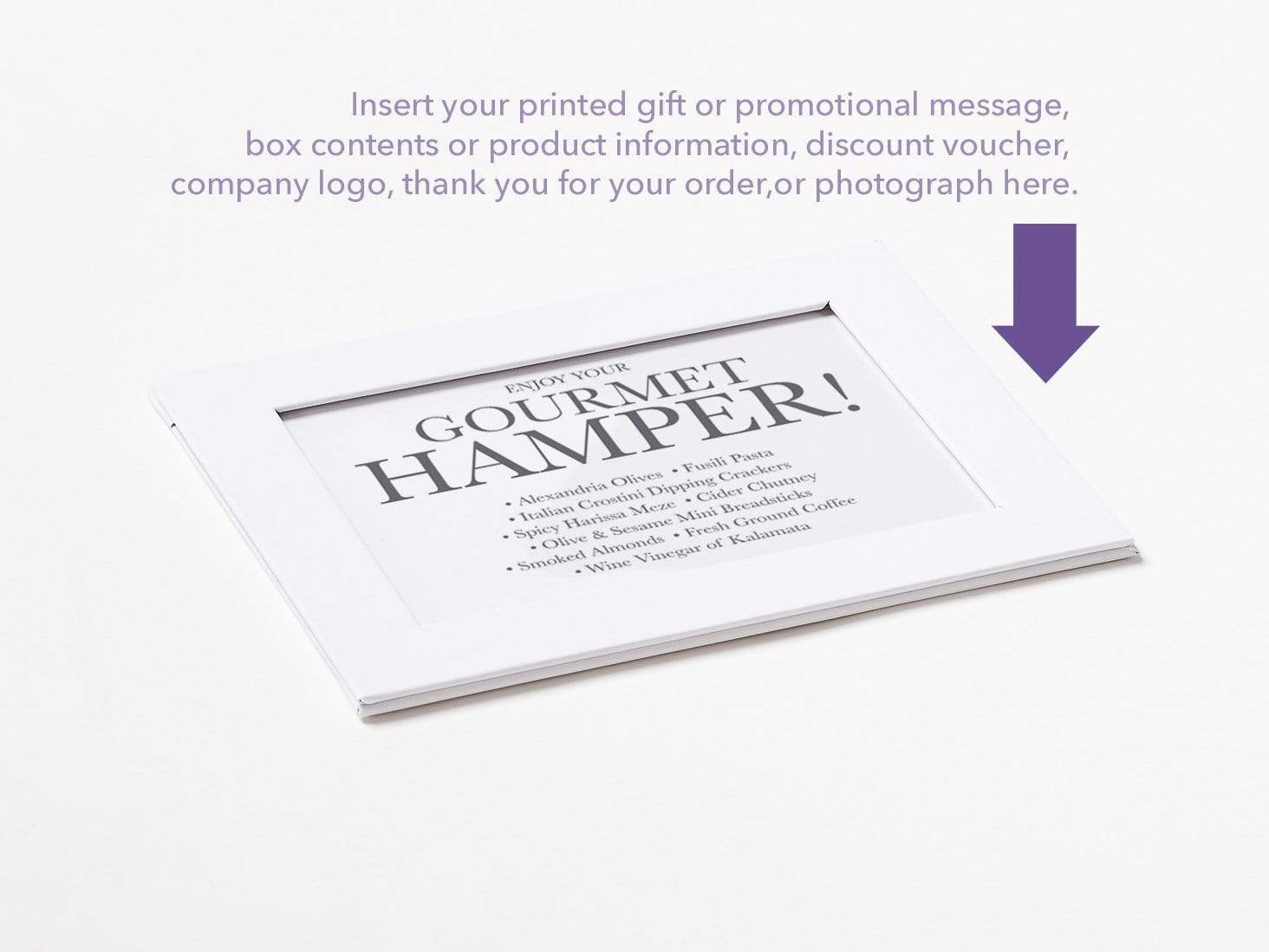 A unique accessory that complement our folding gift boxes by enabling you to add a photograph, printed product information, a company logo, or promotional message to the outside or inside lid of the gift box.
