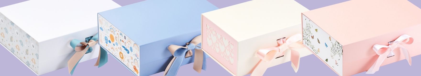 Our extensive collection of white, ivory, silver, pale pink, pale blue, robin egg blue, and rose gold luxury gift boxes provide the perfect blank canvas for creating unique, personalized baby keepsake memory boxes. Ideal for Etsy crafters, boutique baby gift and clothing makers, and small baby centric businesses.