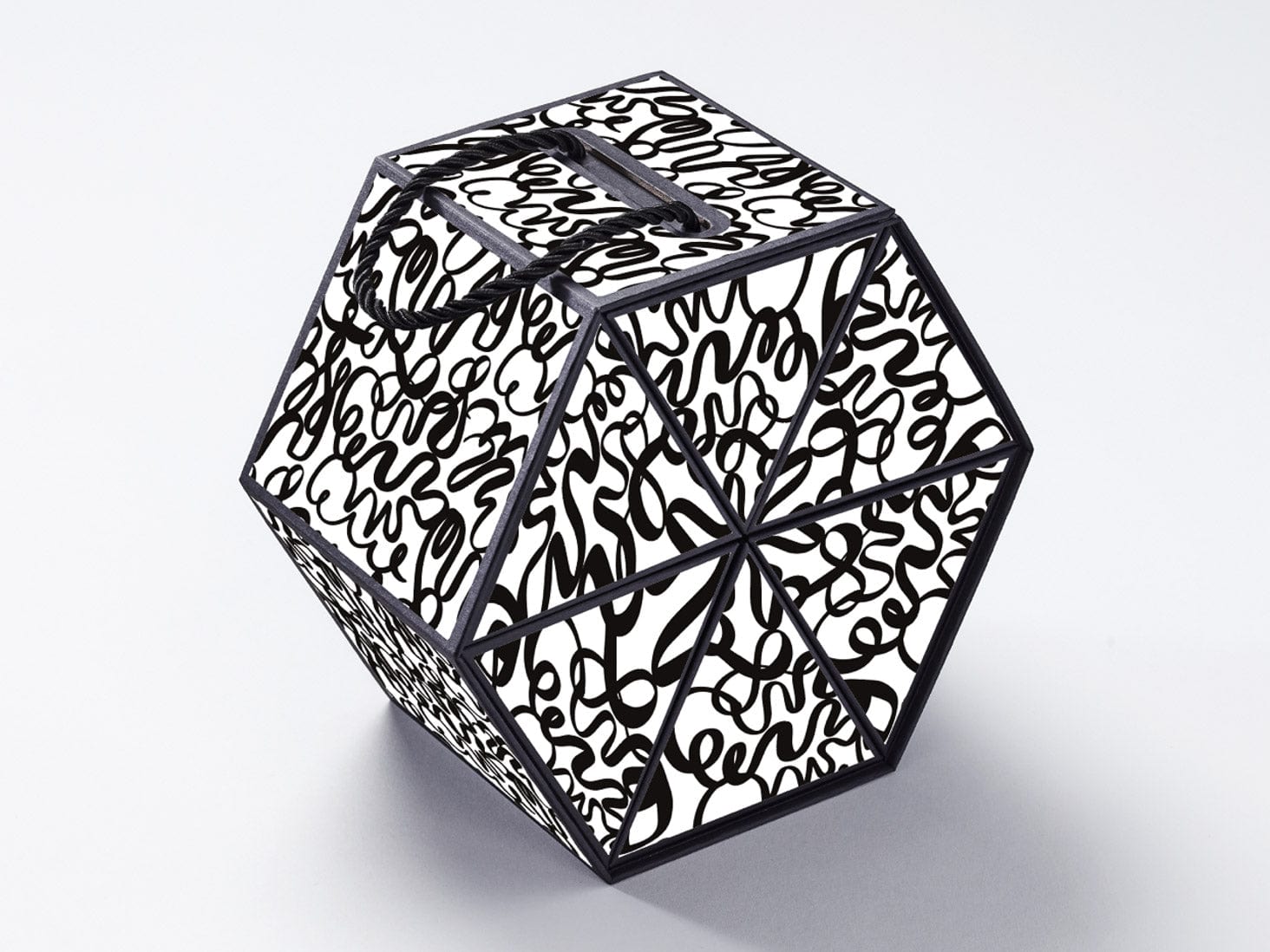 Inside a striking rigid black outer case, six triangular mini boxes fold out and roll into a perfectly formed hexagonal shape, complete with a magnetic closure and twisted rope cord handle. Sleek in black and rich in detail, these RollaBoxes are as stylish as they are smart.
