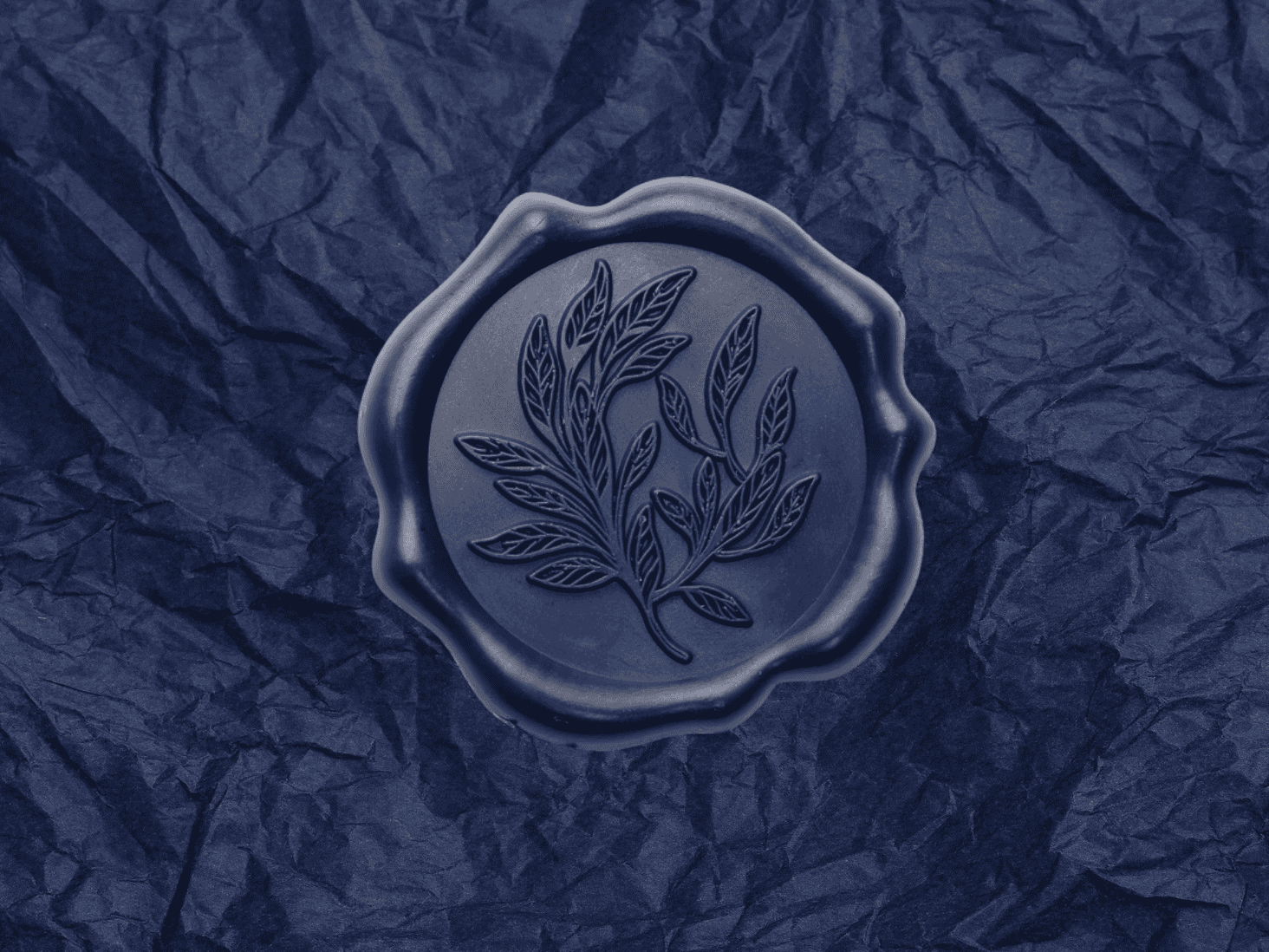 Our pre-made 1 1⁄8" (3cm) diameter Navy Blue Wax Seals feature a finely detailed leaf sprig design with a traditional irregular 3D perimeter, creating an authentic and hand-stamped refined finish. The flat, self-adhesive back makes them quick and easy to apply.